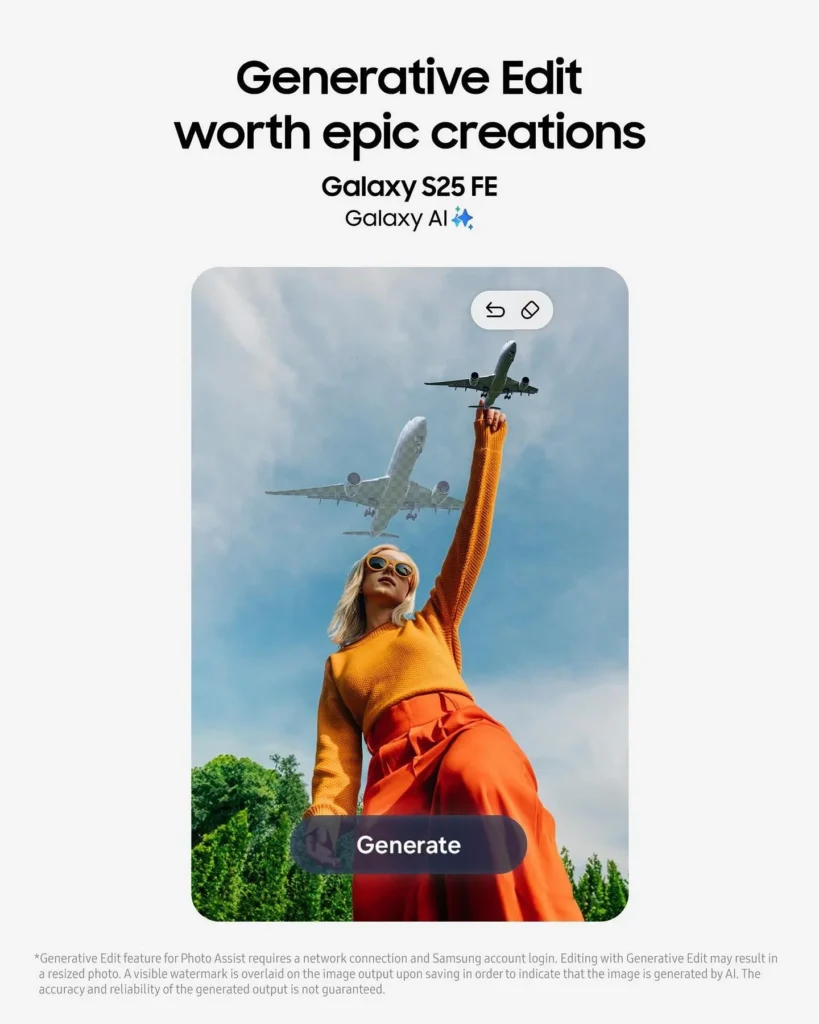 Su cámara frontal es de 12 MP, perfecta para selfies claras y nítidas. También graba en 8K y ofrece herramientas visuales impulsadas por IA, como Generative Edit, Instant Slow‑Mo y Audio Eraser para mejorar fotos y vídeos fácil y rápido.